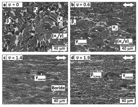 - With an increasing deformation ratio, a finer grain size can be obtained. This fact lasts until φ = 1.4, where a saturation level is reached with a grain size of about 1.8 μm. The characteristic α2/γ colonies disappear continuously and are replaced by globular α2- and γ-grains through dynamic and static recrystallization, surrounded by elongated βo-grains.