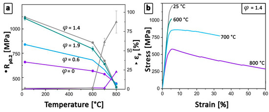 - Employing RT tensile tests, a fracture strain of about 1.3% and a yield strength of 1121 MPa are determined for φ = 1.4. This condition exhibits a fine-grained and homogenous microstructure. At 800 °C, the yield strength amounts to 404 MPa and a fracture strain of more than 87% can be obtained. Additionally, a decreasing grain size is observed, which results in a significantly lower brittle-to-ductile transition temperature.