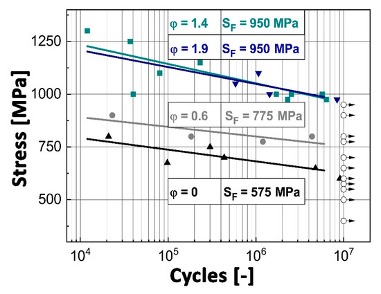 - A clear dependence between the fatigue limit and the degree of deformation is found. Caused by the smaller grain size as a result of the extrusion process, the material’s fatigue limit at RT increases from 575 to 950 MPa. Here, large microstructural constituents are identified as initial defects within the microstructure. However, a high deformation degree reduces the size of these constituents, which is an effective way to increase the endurance limit. Comparing the ultimate tensile strength and the fatigue limit of the different deformed specimens allowed the determination of a proportionality factor in the range of 0.78 to 0.85.