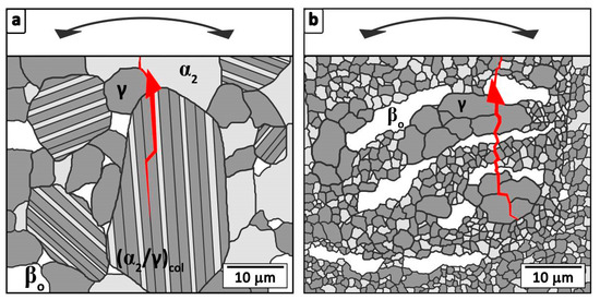- Gnanamoorthy, R.; Mutoh, Y.; Mizuhara, Y. Fatigue crack growth behavior of equiaxed, duplex and lamellar microstructure γ-base titanium aluminides. Intermetallics 1996, 4, 525–532. [Google Scholar] [CrossRef]
