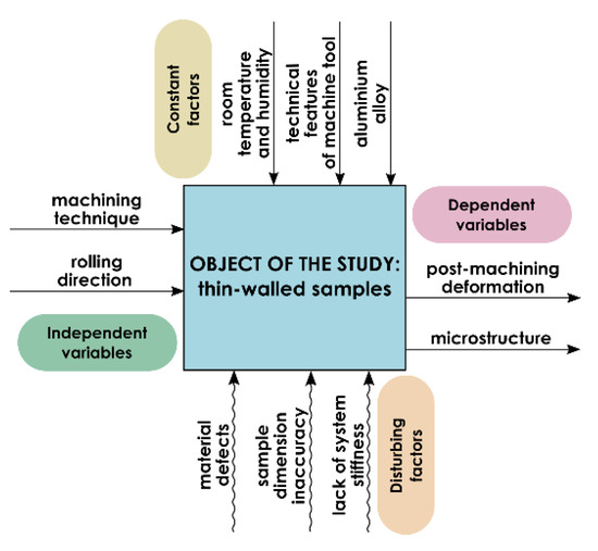 The research object comprised thin-walled samples made of EN AW-2024 T351 aluminium alloy of the following dimensions: 45 mm × 210 mm × 10 mm (Figure 2). The machining technique and rolling direction were assumed as the independent variables. The analysed dependent variables included post-machining deformation and the surface layer microstructure. The constant factors were machine tool technical features, laboratory temperature and humidity as well as the material type. The disturbances included material defects, sample dimension inaccuracy and lack of system (machine tool–clamping device–workpiece–cutting tool) rigidity.