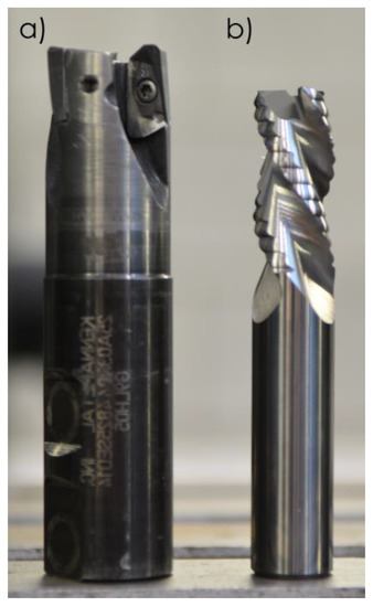 Figure 3. Tools used in studies: (a) Kennametal indexable milling cutter; (b) Sandvik monolithic milling cutter. - monolithic carbide milling cutter by Sandvik (R216.33-16040-AC32U) (Sandvik, Stockholm, Sweden) without a protective coat—used for HSC and conventional finishing (CF) (Figure 3b).
