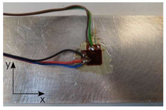 The deformations were studied by means of the strain gauge method using Tenmex TF-5-2x foil strain gauges (Tenmex, Łodź, Poland). Two individual strain gauges were glued to examined sample surface in its central part, according to following directions (Figure 4):