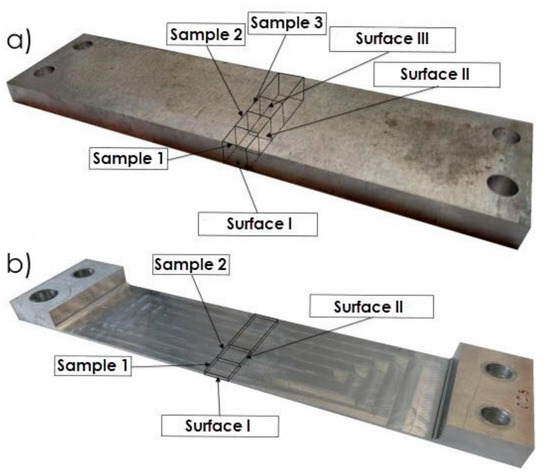 Locations where samples used to prepare metallographic specimens were taken, including highlighting of the examined surfaces: (a) sample prior to machining; (b) sample after machining.