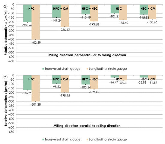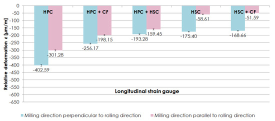 - The relation between the milling direction and rolling direction exerts a significant impact on occurring deformations. Regardless of the milling technique, larger relative deformations ε were obtained after milling in the direction perpendicular to the rolling direction.