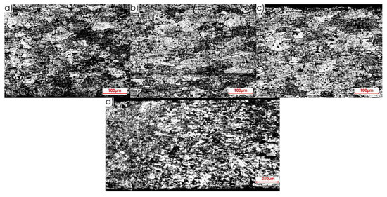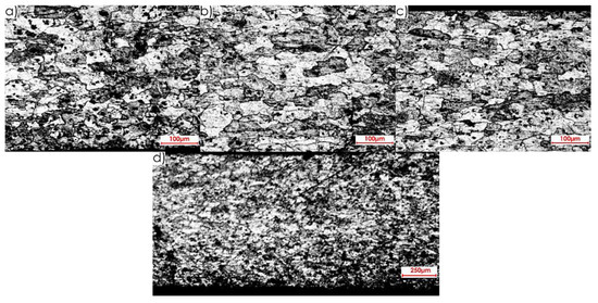 Microstructure after machining using the HPC technique for surface I and perpendicular rolling direction: 20× magnification: (a) surface layer after rolling, (b) core, (c) surface layer after HPC; 2.5× magnification: (d) all sample structure view.