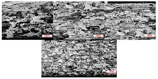 The microstructures of both core and surface layer after rolling observed on surface II for the perpendicular and parallel rolling direction, at 20× magnification, are shown in Figure 10 and Figure 11.