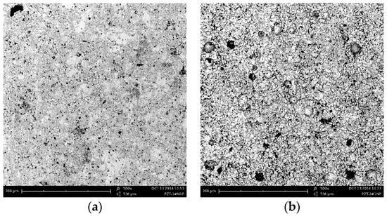 Four kinds of PZT 95/5 ceramics with different porosities were prepared by mixing PZT powders with PMMA (polymethyl methacrylate). The pore former PMMA was spherical 30 μm in diameter, and 0 wt %, 1.0 wt %, 2.0 wt %, or 3.0 wt % PMMA were added into the synthesized PZT powders. The mixed powders were firstly pressed at about 200 MPa to a Φ9 mm and Φ14 mm column with a height of 8 mm; then, they were processed into columns with Φ6 mm × 6 mm and Φ12 mm × 6 mm for testing at a high strain rate and low strain rate, respectively. At last, samples were coated with silver electrodes and poled in a silicone bath at 120 °C for 10 min, and the polarization electric field was 3000 V/mm. Figure 1 shows the SEM images of porous PZT95/5 ceramics with different porosity, which were collected on the samples’ cross-sectional cutting surface. The bulk density was measured using the Archimedes method, and the porosity of the sample was calculated from the ratio of the bulk density to theoretical density (8.08 g/cm3) [1]. The measured results are shown in Figure 1 and Table 1.