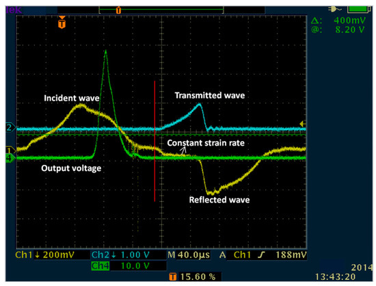 In addition, the compressive load direction is parallel to the poling direction of poled ceramics. A 92 ohm resistor (R) is connected in parallel with the ends of the silver-plated electrode for the sample, as shown in Figure 2. The electrical characteristics of poled ceramics are monitored by measuring the voltage at both ends of the resistor, as is shown in Figure 3. According to the principle of one-dimensional bar elastic wave propagating, we can move the transmitted wave to the middle of the incident wave’s starting times and the reflected wave’s starting times. The stress and discharge voltage are synchronized in time by shifting the transmitted wave, as is shown in Figure 4. The following equation can calculate the remnant polarization of porous poled ceramics in the uniaxial compression experiment: