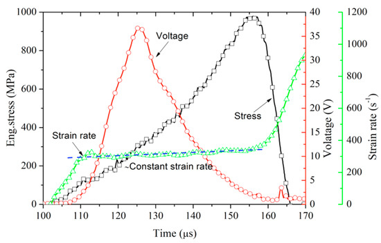 As mentioned above, using Equation (3), strain values averaged over the length of the sample are obtained. However, for the brittle material, it is difficult to achieve stress/strain equilibrium and constant strain rate loading creates an ineffective testing time because of its small failure strain. There are many discussions on the stress uniformity of samples. Most of the methods involve placing a pulse shaper at the front of the incident bar. The striker can impact the pulse shaper first and prolong the loading time to achieve the quasi-static stress equilibrium and constant strain rate before the sample is destroyed. Figure 3 shows the original voltage signals of the incident wave, reflected wave, and transmitted wave recorded in SHPB tests. As shown in the figure, before the sample is destroyed, the obvious plateau line appears in the reflected wave curve, which indicates that the constant strain rate loading is realized by using the pulse shaper technique [22,23,24,25]. On the other hand, for the uniformity of stress/strain distribution, besides the stress equilibrium during loading, whether the local stress concentration may still lead to the strain uniformity is not well satisfied [22]. To study the effect of stress concentration on the uniformity of strain distribution, lubricant was used in the experiment to avoid the influence of friction [26], and a DIC measurement system with an ultra-high-speed camera and two high powerful flashlights was used to obtain the full-field strain of the sample, as shown in Figure 2. The review of the DIC method was presented by Sutton et al. [18]. An ultra-high-speed camera records the sample’s deformation with 1 million fps (frames per second) (the maximum frame rate is 5 million fps, the image resolution is 924 × 768 pixels). Before testing, a speckle pattern is applied to the sample and its sides with spray paint, as shown in Figure 2b. The deformation sample-recorded images during experiments were subsequently analyzed by the commercial VIC-2D software (Vic-2D 2, Correlated Solutions, Inc., lrmo, SC, USA) to determine the field strain.