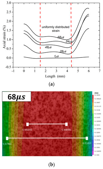 Axial strain distribution along the sample’s length: (a) different times; (b) the contours of strain at 68 .