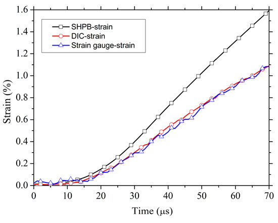 Figure 5 shows the time evolution of the axial strain distribution (the corresponding strain values are determined by the DIC method) during the SHPB testing and the contours of strain at 68 μs. As shown in Figure 5, the strain distribution along the sample length is non-uniform except in the middle region. Such non-uniformity of strain may have resulted from the stress concentration near the contact interface [18]. To correct the effect of stress concentration on the traditional SHPB strain measurement and verify the DIC method, a strain gauge (size ≈3 mm) was placed in the middle of the sample. Figure 6 shows the history curves for eng.strain obtained by traditional SHPB, strain gauge, and the DIC method, respectively. Among them, the strain measured by the DIC method is the uniformly distributed average strain of the sample. It can be seen that the strains measured by the DIC method and strain gauge agree well with each other, which verifies the validity of the DIC method in this experiment. However, the strain of traditional SHPB measured is bigger than that of the above two results. Therefore, we selected the uniformly distributed average strain of the DIC method measured as the axial eng.strain and form the eng.stress–eng.strain curves. As shown in Figure 7, the eng.stress–eng.strain curves of poled ceramics with different porosity at the strain rate of ≈300 s−1 are obtained by the improved SHPB experiment.