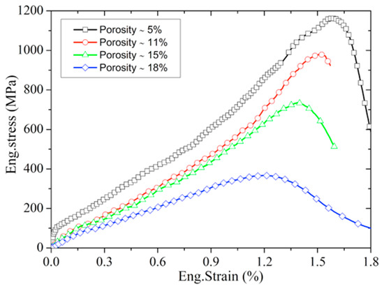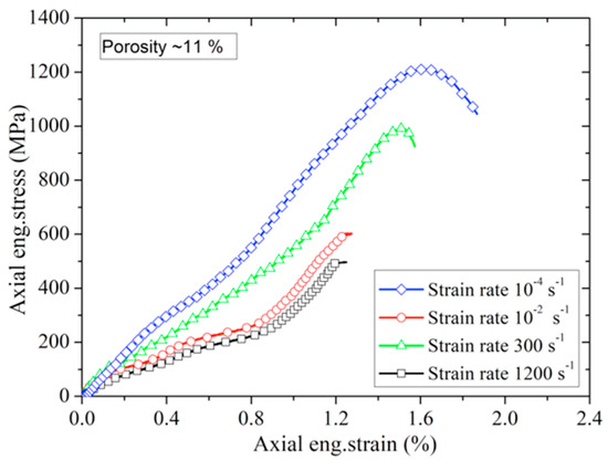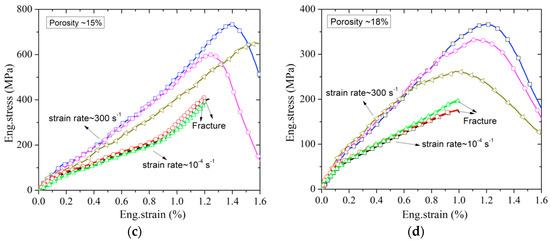 The axial eng.stress–eng.strain curves at the strain rates of ≈10−4 s−1 and ≈300 s−1 of poled ceramics with four different porosities are shown in Figure 9a–d. As can be seen from Figure 9, the repeatability of the stress–strain curves for brittle materials with similar porosity under low and intermediate strain rates conditions is acceptable.