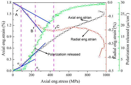 Take porous poled PZT95/5 ceramics with ≈11% porosity for example; the nonlinear characteristics of porous poled ceramics will be analyzed. Representative plots of axial eng.stress versus radial eng.strain and axial eng.stress versus axial eng.strain for porous poled ceramics with ≈11% porosities at the strain rate ≈300 s−1 are shown in Figure 8. Initially, the axial strain and radial strain exhibit a linear behavior with increased stress. This linear behavior corresponds to the elastic response of the ferroelectric phase of pole ceramics. After exceeding the stress corresponding to point “A”, both the radial and axial strains depart sharply from the linear deformation. As the stress increases, the radial and axial strain deviate linearly after exceeding the stress corresponding to point “B”. The deformation in radial direction reverses from tensile to compressive at the stress corresponding to point “C”. As described above, the nonlinear behavior of porous poled ceramics at intermediate strain rate is similar to that of unpole PZT ceramics under quasi-static conditions [14]: (1) the linear slope of ceramics near failure is almost the same as that at the beginning of loading; (2) the anomalous temporary reversal also appears on the curve of radial eng.strain–axial eng.stress curve. According to the similarity of the nonlinear characteristics of stress–strain curves between porous poled ceramics at an intermediate strain rate and unpoled ceramics under quasi-static conditions, we can rule out the possibility of void collapse. Thus, the stress corresponding to points “A” and “B” in Figure 8 can be defined as the critical stress of DS () and PT (), respectively [14]. After that, the linear behavior of axial strain versus stress curve occurs again, which corresponds to the linear elastic behavior of poled PZT95/5 ceramics in an AFE phase. The stress level of point “A” in Figure 8 can be defined as critical stress for the DS, which is denoted as .