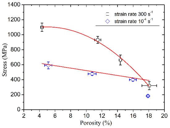 The compressive strength vs. porosity at the strain rate of 300 s−1 and 10−4 s−1.