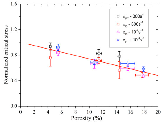 According to the measured stress–strain curves of porous poled ceramics with different porosities in Figure 9, we also examined the porosity dependence of the critical stress for the initiation of DS and PT at the strain rate of 10−4 s−1 and 300 s−1, respectively. First, the critical stress of and are normalized as a function of porosity by and , where and are the values of and for the materials at a porosity of 0%. These values were determined to be ≈ 108 MPa, ≈ 199 MPa at the strain rate of 10−4 s−1 and ≈ 156 MPa, ≈ 270 MPa at the 300 s−1 strain rate, which were obtained by linear fitting of the relationship between and and porosity. It is a pity that we have not found the anomalous temporary reversal of the radial eng.strain–eng.stress curves of the samples with ≈18% porosity. Therefore, the values of for the samples with ≈18% porosity are not shown in Figure 11. The normalized and at the 10−4 s−1 and 300 s−1 strain rates show similar declining trends with the increasing porosity, as shown in Figure 11. Therefore, the relationship between the normalized , and porosity could be expressed by a linear regression formula as follows: