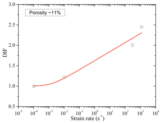 The eng.stress–eng.strain curves of porous poled ceramics at approximately the same porosity (≈11%) with different strain rates are shown in Figure 14. The stress–strain curves of porous poled ceramics at different strain rates exhibit nonlinear characteristics for all of these tests. Compared with the quasi-static tests, poled ceramics’ compressive strength is significantly enhanced at the high strain rate. This significant increase in brittle materials’ strength has generally been explained as the strain rate effect [29,30]. The DIF (dynamic increase factor) is usually used to characterize brittle materials’ strain rate sensitivity, which is defined by the strength ratio under high strain rate to the strength under quasi-static tests [17]. Figure 15 shows the DIF of porous poled ceramics with ≈11% porosity as a function of strain rate. A sharp increase in strength was observed between quasi-static and dynamic loading conditions, as shown in Figure 15. The strain rate effect of porous poled ceramics can be expressed by the DIF logarithmic regression equation as follows: