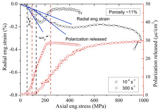 The polarization released of poled ceramics with different porosities under the strain rate of ≈10−4 s−1 and ≈300 s−1 as a function of stress.