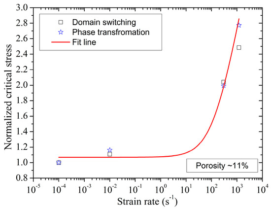 As discussed earlier, the nonlinear mechanism of porous poled ceramics under uniaxial stress loading is caused by DS and PT. For porous poled ceramics, the strain rate effect affects the compressive strength and the nonlinear mechanical characteristics, as is shown in Figure 16. The value of at the strain rate of 300 s−1 is ≈98.8 MPa, which is much higher than the value of (≈48.2 MPa) obtained for poled ceramics under quasi-static test. In addition, the value of is ≈250.7 MPa at the high strain rate, which is higher than quasi-static conditions (≈117.2 MPa). Thus, the value of and show a very similar declining trend with the increase of strain rate, as shown in Figure 17. The correlation between normalized critical stress and strain rate is expressed by the formula similar to Equation (5):