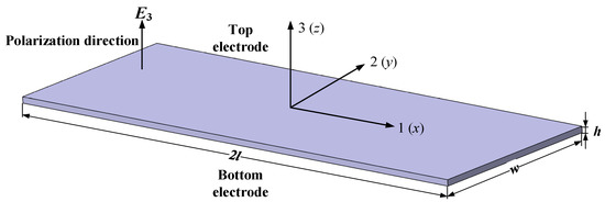 A thin-walled rectangular PZT has a length of 2l, width w, and thickness h. The PZT is assumed to undergo the longitudinal expansion along the 1-direction induced by the electric field E3 in thickness polarization, as shown in Figure 1. The electric field E3 is produced by applying the harmonic voltage between the top electrode and bottom electrode, which is defined by . The electric field is assumed to be uniform over the whole thin-walled piezoelectric ceramics.