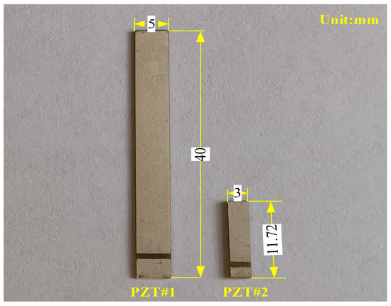 For convincingly demonstrating the predicted curve with the EMI model presented in the theoretical section, two different PZTs were applied in the experiments. The thin-walled rectangular PZTs used in experiments were provided by the Shanghai Institute of Ceramics, PZT-5A (numbered PZT#1) and PZT-5A1 (numbered PZT#2). The size of PZT-5A and PZT-5A1 are separately 40 mm × 5 mm × 0.34 mm and 11.72 mm × 3 mm × 0.78 mm in length, width, and thickness direction. The properties of PZT with electrodes coated silver on both sides are enumerated in Table 1. The comparative schematic of the two mentioned PZTs used in experiments is illustrated in Figure 3.