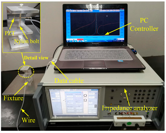 The fixture used for clamping the PZT was made of 6061-T6 aluminum alloy. Two nylon bolts were adopted to constrain the PZT to prevent the top and bottom electrodes from short-circuiting, as shown in Figure 4. A cable was employed to connect the laptop with the impedance analyzer to transmit data. Meanwhile, a conductive wire was soldered with PZT and connected with an impedance analyzer to acquire experimental signals.
