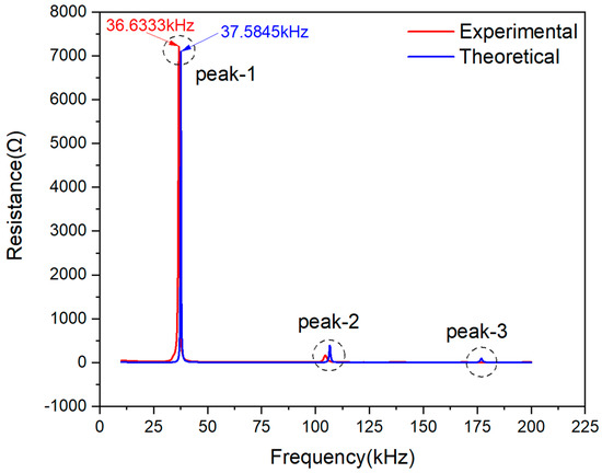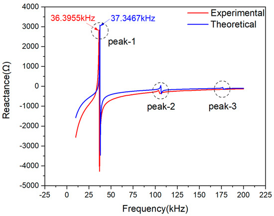 Figure 8 shows good consistency between the theoretical and the experimental curves in their imaginary part. Three peaks were observed on reactance curves. The main peak marked with Peak-1 of experimental data is at the frequency point of 36.3955 kHz, while the theoretical one is 37.3467 kHz. Referring to the processing method on the basis of the resistance signals, the main peak frequency deviation between the two reactance curves at Peak-1 is 0.9512 kHz. Besides, there is also a deviation in signal magnitude at Peak-1 and -2, but the two peaks are too small in magnitude to be analyzed compared with Peak-1.