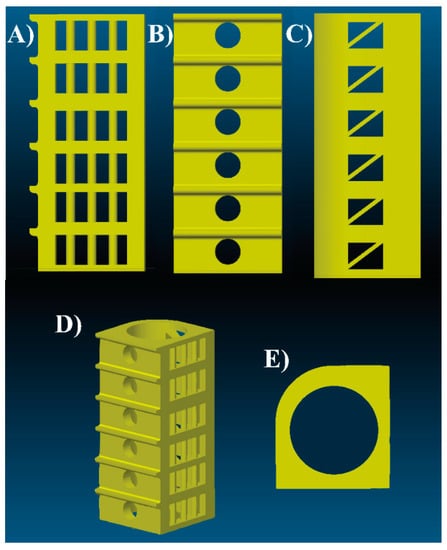 Temperature tower model: (A–C) lateral views, (D) axonometric view, (E) top view [].