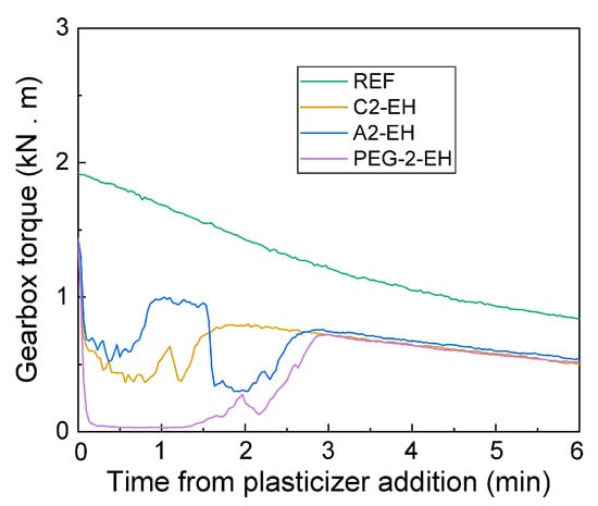 Dependence of gearbox torque on the time elapsed from the addition of plasticizers to the poly(3-hydroxybutyrate) and poly(lactic acid) (PHB-PLA) mixture.
