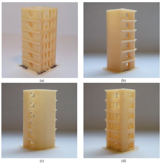 Examples of temperature towers 3D printed at 195–170 °C (minus 5 °C for each floor) from PHB-PLA-plasticizer filaments: (a) reference without plasticizer, (b) with C2-EH plasticizer, (c) with A2-EH, (d) with PEG-2-EH.