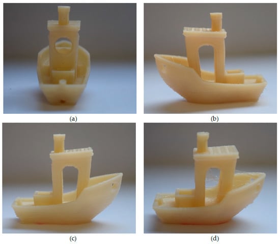 The 3D Benchies were printed for each PHB-PLA-plasticizer filament at printing temperatures optimized via the temperature tower and warping tests. Resultant printing temperatures varied in the range of 180–195 °C (the first layers were printed at 195 °C). Printed 3D Benchies were then visually evaluated [], and thus, the adjusted printing conditions were revised.