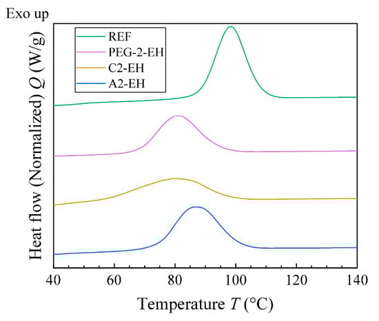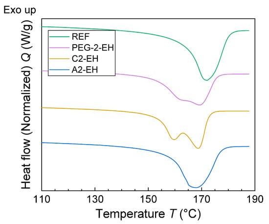The gearbox torque dependence (kN∙m) on the time after the plasticizer was added to the PHB-PLA mixture can be seen in Figure 4. The PHB-PLA mixture had already been dosed for 1 min and kneaded for 2 min. These dependencies (of plasticized samples) are compared with the reference sample (70-30 PHB-PLA in wt.%). In the case of PEG-2-EH (see Figure 5), the gearbox torque first declined to 0 kN∙m after the plasticizer addition due to the lubrication of the blades by the plasticizer. These results are in agreement with our previous work, in the case of C-4 and A-4 plasticizers []. The torque resistance approached zero because the blades could move freely. After, the gearbox torque increased, because the plasticizer started to mix with PHB-PLA. Finally, the gearbox torque achieved the maximum, which corresponds to the moment of the plasticizer blending with the PHB-PLA. All plasticizers (in the concentration of 15%) were miscible with PHB-PLA within maximally 6 min of total kneading time, which corresponds to a maximum of 3 min from when the plasticizers were added. The addition of C2-EH and A2-EH plasticizers did not cause the gearbox torque declination to 0 kN∙m, which may mean a smaller lubrication effect of these plasticizers. The plasticizer C2-EH were kneaded into the PHB-PLA mixture faster than the plasticizers A2-EH and PEG-2-EH. The plasticizer with the acetyl group in the structure (A2-EH) needs more kneading time. This result is in good agreement with our previous work [], where the plasticizer with the acetyl group A-4 (acetyl tributyl citrate) needed more kneading time compared to the plasticizer C-4 (tributyl citrate). The plasticizer structure also became evident for PEG-2-EH, where the kneading time was the longest due to a longer polymeric chain. As can be seen, all selected plasticizers were successfully kneaded with the PHB-PLA mixture.