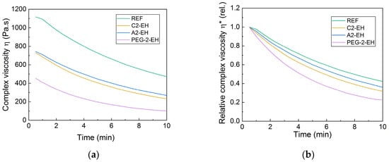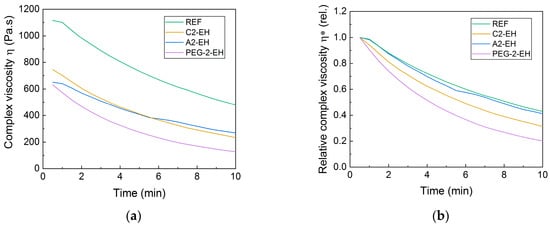 For the evaluation of the degradation rate under thermal and shear loading, the relative complex viscosity was calculated for each sample according to the formula: