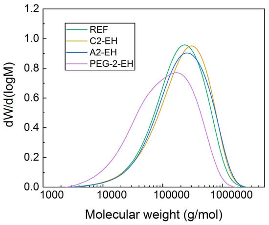 Monomeric commercial plasticizer used in this research is based on the ester of citric acid (acetyl tris(2-ethylhexyl) citrate) and is provided by Jungbunzlauer Suisse AG (Basel, Switzerland), with the Citrofol® trademark []. An additional monomeric plasticizer based on the ester of citric acid (tris(2-ethylhexyl) citrate) was synthesized for this study. Another commercial plasticizer, poly(ethylene glycol) bis(2-ethylhexanoate), was provided by Merck KGaA (Darmstadt, Germany) []. The plasticizers described by commercial and chemical names, molecular weights, and labels can be seen in Table 1. Their structure can be seen in Figure 1.