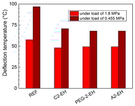 A custom-made apparatus for the HDT measurements of plastics under flexural load in flatwise position was used for the testing of 3D printed PHB-PLA-plasticizer samples, according to CSN EN ISO 75 standard specifications []. Three-dimensional printed sample bars, (their 3D model was formed from perimeters only) with (80 × 10 × 4) mm dimensions, were immersed under load in a heat-transfer medium (silicon oil) provided with the means of raising the temperature by (2 ± 0.2) °C/min. The load applied to the specimen center to give the maximum fiber stresses was 1.82 MPa and 0.455 MPa (Standard Method A and B), respectively. When the test bar deflected by 341 μm, the temperature of the medium was recorded. Two sample bars of all PHB-PLA-plasticizer and PHB-PLA reference samples were subjected to measurements simultaneously for a given load.