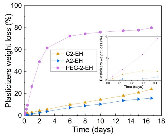 The weight loss (%) measurements were also carried out on the reference sample. An insignificant decrease in the reference weight loss was measured, which we attribute to water evaporation (0.3% after 1 h, 0.4% after 2–16.7 days). These continuous values were subtracted from other samples with plasticizers.