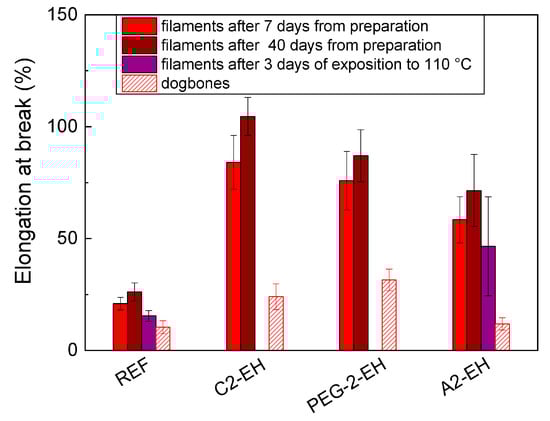 Tensile test measurements of filaments with A-4 and C-4 plasticizers have already been published in our previous work [], and these results can serve as a comparison with other plasticizers, to see how plasticizer structure influences elongation at break.