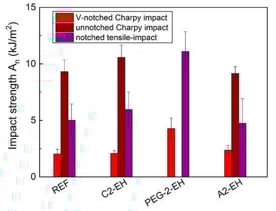 As can be seen in Figure 16, PHB-PLA samples with C2-EH and A2-EH plasticizers almost did not influence evaluated Charpy and tensile-impact strength, An (kJ/m2), as compared to the non-plasticized reference. In the case of a sample with A2-EH plasticizer, un-notched Charpy and notched tensile-impact strength are even slightly lower. Their evaluated impact strength is within the error frame, especially the tensile-impact measurements had quite a large error frame. The evaluated impact strength was not influenced only by the material properties, but also by the structure of the 3D printed specimens. The breakage in the case of tensile-impact tests proceeded along 3D printed perimeters. The enhancement of impact strength measured from V-notched Charpy and notched tensile-impact is apparent for the samples with PEG-2-EH plasticizers. Notched tensile-impact strength of PHB-PLA-PEG-2-EH samples only slightly increased to 11 kJ/m2, as compared to 5 kJ/m2 of the non-plasticized reference.