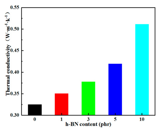 The composites doped with h-BN fillers obtain better thermal conductivity, as shown in Figure 4. When the h-BN filler content is 10 phr, the thermal conductivity of h-BN/LDPE composites is up to 0.51 W/(m·K)—57% higher than that of LDPE (0.32 W/(m·K)). Although the thermal conductivity of the composite material was noticeably improved with the increase of the h-BN filler content, it may cause the insulation performance of the composite material to deteriorate. Research has shown that the useful improvement of the thermal conductivity of composites is closely related to the formation of thermally conductive networks of highly thermally conductive inorganic particles inside the composites [18,19]. At the same time, the observation results shown in Figure 3d show that h-BN cannot build a complete thermal conduction network in the composite material, although h-BN is partially accumulated in the composite at a relatively high content.