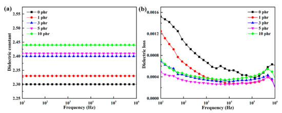 Figure 5 shows the frequency-dependent dielectric constant and dielectric loss of LDPE and different h-BN/LDPE composites. As shown in Figure 5a, the dielectric constant of LDPE is about 2.3 at 10–106 Hz at room temperature, while the dielectric constants of the composite materials are slightly increased. The dielectric constants of composites with 1 and 3 phr h-BN particles only increased to 2.33 and 2.4, respectively. This shows that the dielectric constant of h-BN/LDPE composites is stable with frequency and does not change the low dielectric constant of LDPE. Figure 5b shows the relationship between the dielectric loss and the frequency of the composite material. The dielectric loss of the composite material is hardly affected by the h-BN filler, and remains in the range of 0.0004 to 0.0018. It has excellent dielectric properties and meets the insulation performance requirements of DC cables.
