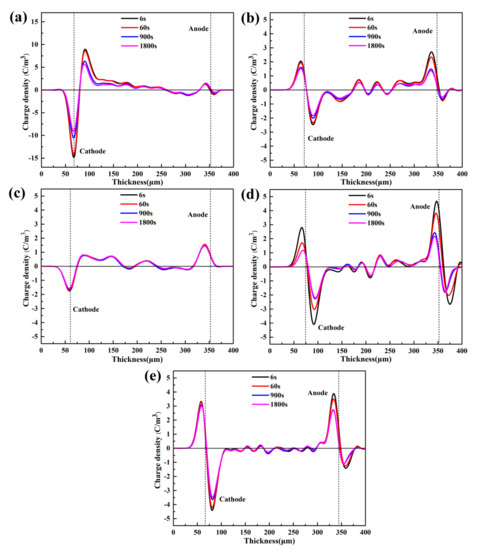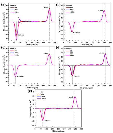 Figure 6 illustrates the distribution of the space charge inside samples of pure LDPE and its composites at 1800 s with a polarization electric field of 40 kV/mm. As shown clearly from Figure 6a, when the electric field is 40 kV/mm and applied for 6 s, the space charge is injected into pure LDPE from anode and cathode. There is apparent hetero-polar charge accumulation near the cathode, and homogeneity-polarity charge accumulation is observed in the anode. As the polarization time reaches 900 s, the space charge around the cathode accumulates and forms a charge packet, and the charge of the same polarity near the anode decreases. When the polarization time reaches 1800 s, the charge packet near the cathode does not increase significantly.