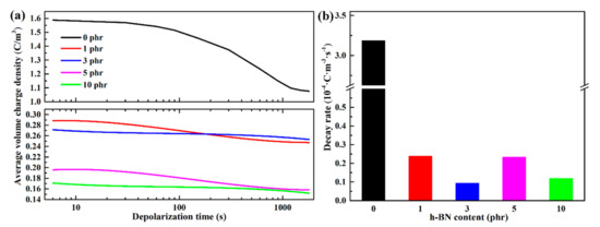(a) The average volume charge density and (b) decay rate of the LDPE and h-BN/LDPE composites during depolarization after poling at 40 kV/mm.