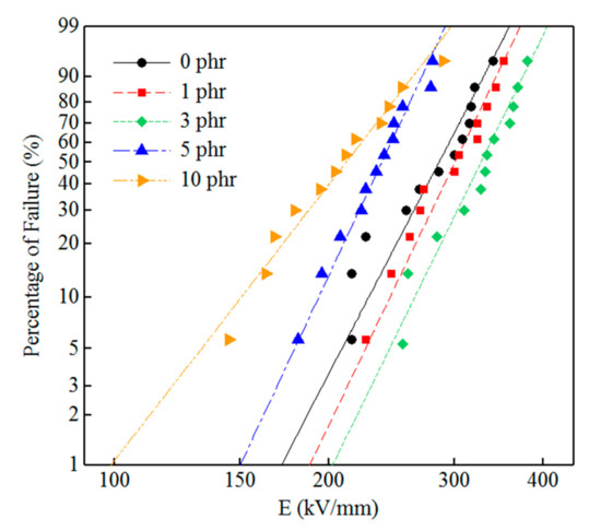 It can be clearly observed from Table 1 and Figure 9 that the DC breakdown strength of pure LDPE is 298.2 kV/mm. After filling h-BN in the LDPE matrix, the DC breakdown strength E0 of the composite material first increases, reaches a maximum value at 3 phr, and then decreases. The composite materials with 1 and 3 phr h-BN filling materials have breakdown field strengths of 313 and 340.7 kV/mm, respectively, which are 4.96% and 14.3% higher than those of pure LDPE. This is primarily due to the uniform dispersion of h-BN particles in the LDPE matrix at low filling of h-BN particles. The interface between the h-BN filler and the substrate interaction region will introduce the effect of deep traps, reduce the carrier concentration and mobility, and suppress the space charge accumulation under a DC electric field [24,25,26]. Previous studies have noted that an essential factor leading to insulation failure under DC electric field is space charge accumulation, and the introduction of h-BN filler can suppress this. However, with the further addition of h-BN fillers (content > 3 phr h-BN particles), the breakdown strength E0 of the composite deteriorates, which may be caused by defects introduced inside the sample. Simultaneously, when the h-BN filler content is high, the h-BN particles show relatively low dispersion and relatively large agglomeration in the LDPE matrix. Filler agglomeration may act as a defect, worsen the electric field distortion around the filler, cause the partial discharge of the sample, and eventually lead to a decrease in the breakdown field strength of the composite material [27]. In short, composites doped with 3 phr h-BN particles have better breakdown characteristics.