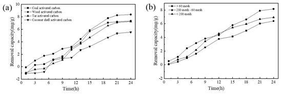 (a) Effect of activated carbon type on NICLS removal capacity; (b) effect of activated carbon particle size on NICLS removal capacity (activated carbon is wood activated carbon).