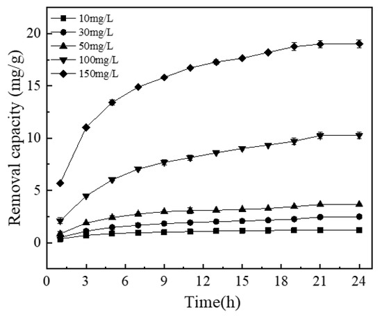 Figure 7 shows the relationship between phosphorus removal by the NICLS and reaction time at different initial phosphorus concentrations of 10, 30, 50, 100, and 150 mg/L. Within the first 5 h, the removal capacity corresponding to different initial phosphorus concentrations shows an upward trend, and then the removal process becomes very slow and eventually reaches equilibrium. This may be because at the beginning of the reaction, iron-carbon contact is more complete, redox and other reactions occur more fully, more Fe2+ is generated at the anode, more Fe3+ is oxidized, and there are sufficient adsorption sites on the surface of the activated carbon, which is more conducive to the removal of phosphorus [15,51]. However, as the reaction time increases, the surface of the NICLS is passivated, and therefore, the removal of phosphorus no longer increases significantly. As seen from Figure 7, for the 10 mg/L phosphorus solution, the removal of phosphorus by the NICLS takes only 5 h to reach equilibrium; for the 30 mg/L phosphorus solution, it takes 9 h to reach equilibrium; for the 50 mg/L phosphorus solution, equilibrium can be reached within 13 h; for the 100 mg/L phosphorus solution, it takes 18 h to reach equilibrium; while the 150 mg/L phosphorus solution needs 21 h. Obviously, an increase in initial phosphorus concentration leads to a significant increase in equilibrium time and removal capacity [52].