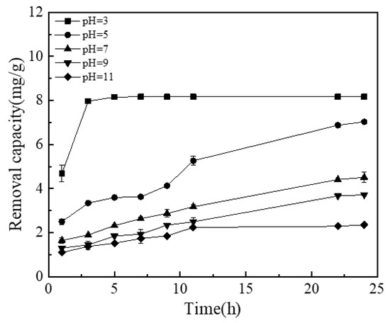 Using the same test method of phosphorus removal by the NICLS, we set different pH values (3, 5, 7, 9, and 11) to determine the effect of pH on the NICLS removal of phosphate ions [35]. The calculation formula used to determine the removal capacity is formula (1).