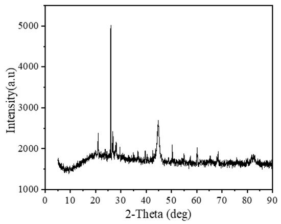 A surface area analyzer was used to measure the BET surface area (SBET) and pore volume of the NICLS from the 77 K nitrogen adsorption/desorption isotherm [36]. The pore size was derived using the BET and DFT methods [37]. Scanning electron microscopy (SEM) was used to characterize the surface morphology of the NICLS before and after the reaction, and energy-dispersive X-ray spectroscopy (EDS) was used to determine the composition change in the NICLS before and after the reaction [38,39]. X-ray diffraction (XRD) patterns of the NICLS were recorded with an X-ray diffractometer (China DX-2700), (Cu Kα, 30 mA, 40 kV) [40].