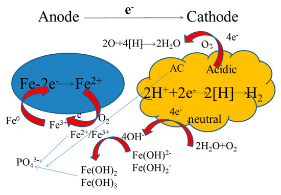 In addition to the above chemical precipitation process, the following processes occur (Figure 12). Iron coagulation: The anode produces a large amount of Fe2+ and Fe3+ during the micro-electrolysis process, which are very good flocculants and will be converted into Fe(OH)2 under appropriate pH conditions. If oxygen is present, the iron will also be converted into Fe(OH)3, and a mixture of nFe(OH)2 and mFe(OH)3 will also be formed; the resulting flocs can neutralize the colloidal charge; promote colloidal collision, coagulation, and precipitation; and promote the removal of phosphorus (this may also be the phosphorus removal mechanism under alkaline conditions). Physical adsorption: The activated carbon of the cathode is also a good adsorbent with a certain adsorption capacity for phosphorus (this was also proven in the preliminary test) [57].