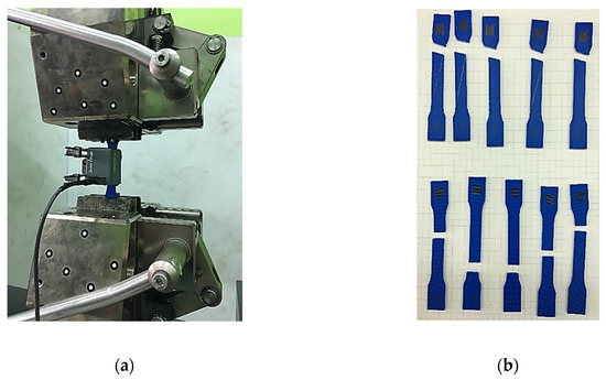 (a) View of the sample with the extensometer on the test stand. (b) A set of samples with longitudinal and transversal fiber orientations after completion of the test.