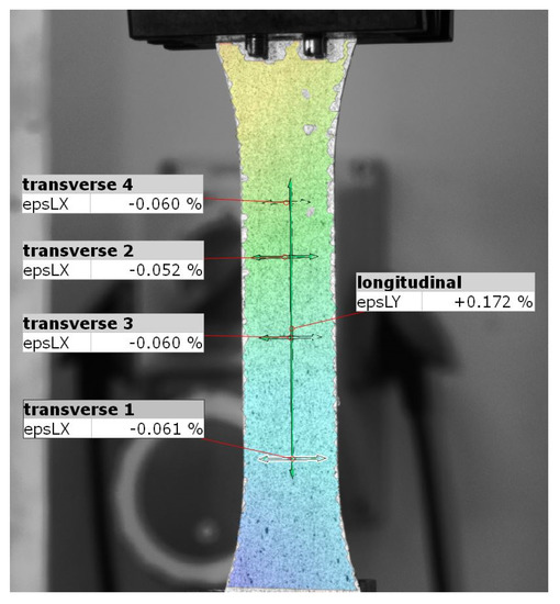 In the next step, the Poisson number was measured. For this, a sample with a longitudinal fiber orientation was elongated. Measurements were made using the Aramis optical scanner (GOM GmbH, Braunschweig, Germany) based on the Digital Image Correlation method (DIC) [26]. This method enables noncontact measurements of the displacement field through analysis of the changes in the distribution of stochastically distributed spots in the photos of the sample in the subsequent loading phases [27,28,29].